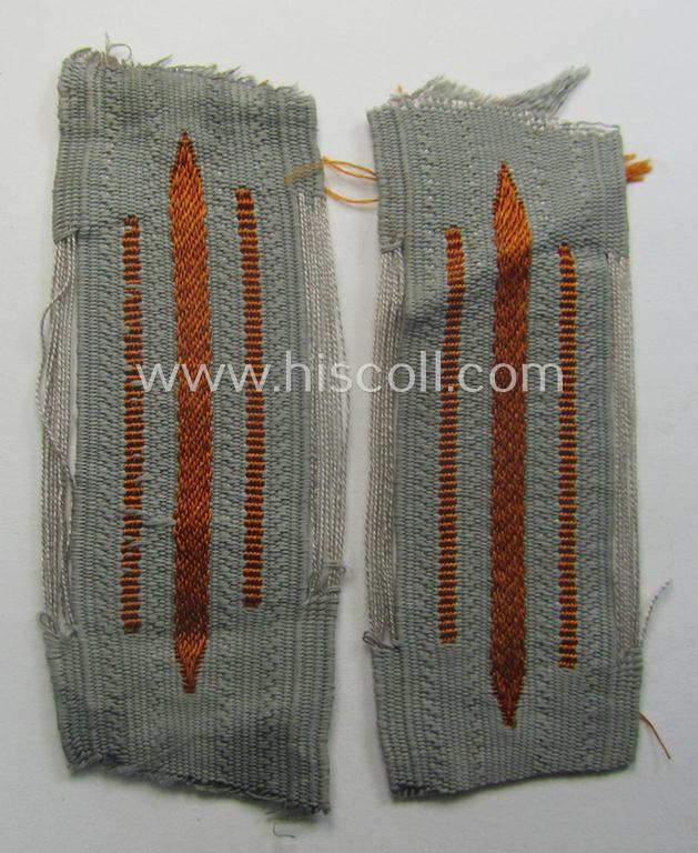 The neat - 'all-linnen'-based and/or fully matching! - pair of 'Gendarmerie' (ie. police) mid- (ie. later-) war-period- and/or: 'standard-issued'-pattern collar-tabs (or: 'Einheitskragenspiegel für Mannschaften u. Unterführer der Gendarmerie') being of the desirable 'generic-pattern' which are piped in the typical, bright-orange-coloured (ie. 'generic'-style) branchcolour having an equally bright-orange-coloured 'centre-stripe'and were as such intended for usage by all soldiers (ie. NCOs) within all 'Gendarmerie'-related branches of the: 'Deutsche Wehrmacht' troughout the war. The tabs come in an overall very nice- (ie. 'virtually mint- ie. unissued'-) condition and were simply never used- nor tunic-attached (as can be seen on the pictures). Both tabs just show some minimal storage-age only and came as 'straightly cut-off the role' (as can be seen on the pictures). These pairs saw wide-spread usage throughout the 'Deutsche Wehrmacht' and were directly sewn to the collar (without having a 'backing'). As such is the set on offer here a great pair to complete any police-tunic or to be simply stored in any insignia-collection!