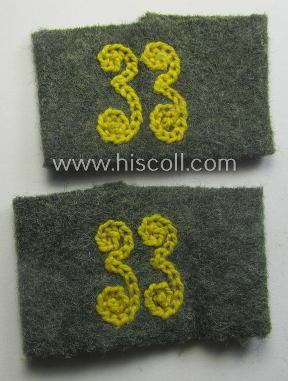 This is an attractive - truly matching and/or fully identical! - pair of WH (Heeres) 'Nachrichten'-related, so-called: regimental shoulderstrap-'slip-ons' (ie. 'Schulterstück-Überschuben') as was specifically intended for usage by a: 'Soldat des Nachrichten-Abteilungs 33' and that comes in an overall very nice- (and I deem simply never worn- nor used- ie. still 'virtually mint unissued'-), condition. The pair is neatly 'machine-stitched'-embroidered in the typical bright-yellow- (ie. 'zitronengelber'-) coloured wool by means of so-called: 'Kurbelstickerei' as to be expected. Simply a nice opportunity to aquire an attractive pair of 'Nachrichten'-related 'Überschuben' that is - I deem - accordingly priced: great to 'decorate' a pair of 'bright-yelloe'-piped 'Heeres'-shoulderstraps or ideally fitted to keep in any insignia-collection!