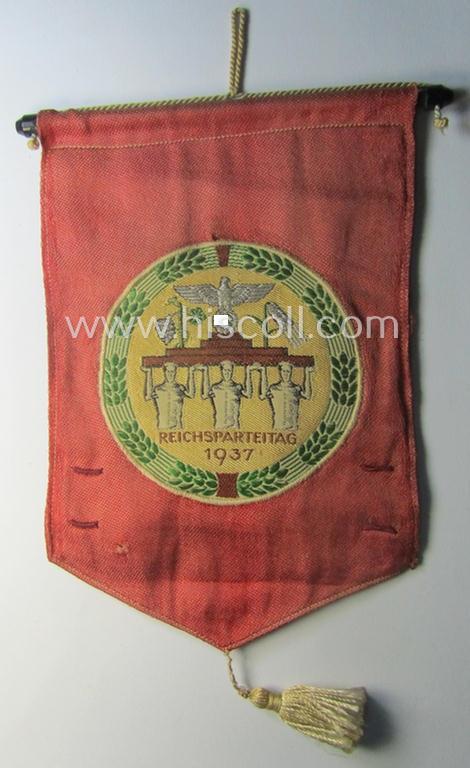 The neat - medium- (ie. somewhat smaller-) sized flag - which measures from top to point approximately 18,5 cms. and that is approximately 12,5 cms. wide - is nicely constructed from (I deem minimally sun-faded) bright-red-coloured linnen and shows one side an interwoven and bright-green rimmed (and multi-coloured) illustration of three men holding a statue of a 'Reichsadler'-device coupled with the text: 'Reichsparteitag 1937' (and as such showing the device that was specifically designed for usage for this annual party-rally) and on the other side an (equally nicely woven) patch showing a towns'-view of the city of Nürnberg. The decorative 'Fahne' is (I deem) just moderately used and does show some minimal age and/or staining caused by slight usage and/or decades of storage (it is however totally void of any real damage or alike as can be seen on the pictures). The neat piece is 'double-sided' still shows its 'attachment-construction' in place (intended to attach it to a bicycle or vehicle or alike). Of additional interest is, moreover, the fact that this example shows four period-attached Laschen (which are I deem there to place two 'tinnies (or 'Veranstaltungsabzeichen') from this particular party-meeting. I am convinced that this is a quite scarcely encountered party-related item that did not saw wide-spread usage and that is with certainty accordingly priced!