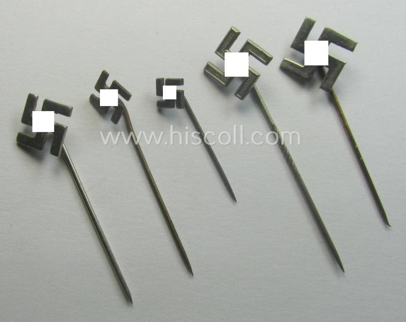 This is an interesting, 5-pieced set comprising of five so-called: 'N.S.D.A.P.'-related supporter-pins- (ie.: 'Symphatisanten-Abzeichen') that depict a swastika-sign and that come in various sizes being all five non-maker-marked examples that come all five in an overall nicely preserved, condition. All five pieces (which I deem have all been moderately used ie. worn) have a nicely preserved age-patina and have most certainly never been cleaned nor polished: they are showing normal wear but are void of any damage (as can be seen on the pictures). The lapel-pins show, moreover, a somewhat tarnished- (ie. minimally stained-) finish as can be seen from the pictures. All pieces come mounted onto their regular-styled, longer-sized pins which are naturally still fully functional and/or present. The set was found together as such and will also be sold as a group of five specimen. I deem that this is an attractive - and actually not that easily found! - grouping comprising of five differently-styled 'N.S.D.A.P.'-related supporter-pins- (or: 'Symphatisanten-Abzeichen') that is I deem priced according to their nicely preserved and fully untouched condition!