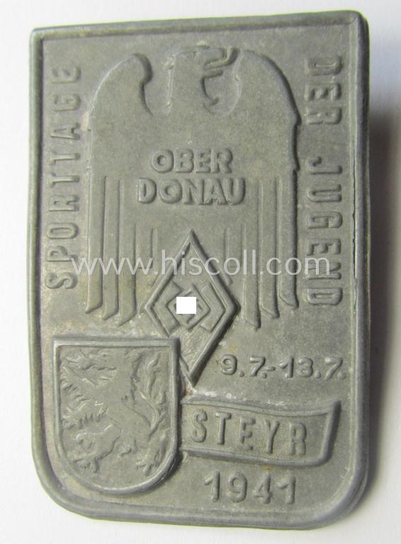 Austrian, HJ- (ie. 'Hitlerjugend'-) related day-badge (ie. 'tinnie' or: 'Veranstaltungsabzeichen') as was issued to commemorate a HJ-related event and that is entitled: 'Sporttag der Jugend - Oberdonau - Steyr - 9.7. - 13.7.1941'