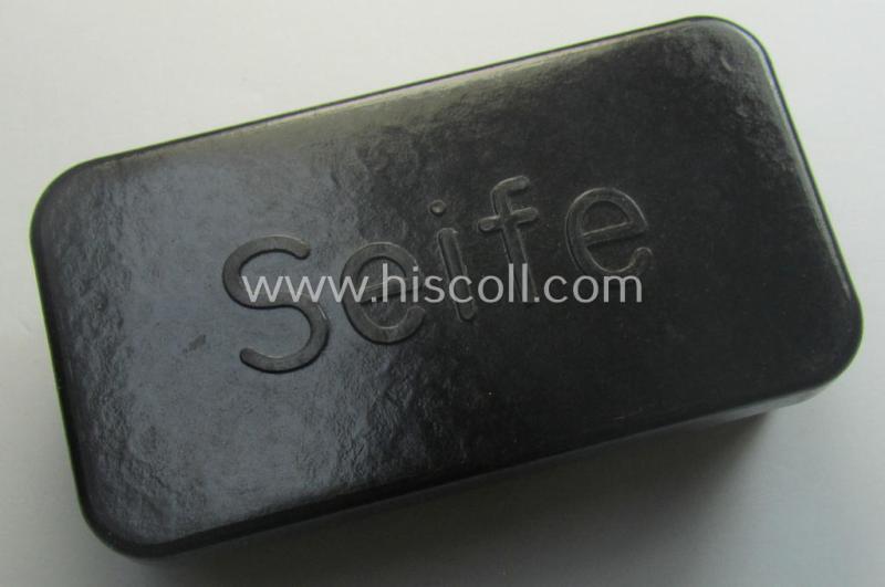 This is an attractive example of a 'standard-issue'-pattern, WH 'Seifebuchse' (ie. soap-container) being a pristine and totally undamaged example as executed in (very dark-toned) brownish-red-coloured 'Bakelite' and that comes in an overall very nice- (and or totally undamaged- and I deem just moderately used-), condition. These fairly small-sized personal-items (only sized: 8 x 4,5 x 2,5 cms.) were executed in brownish-red-coloured 'Bakelite' and ranked amongst the 'basic'-equipment of any front-soldier and were stored in the bread-bag. This example is only minimally used and shows hardly any wear nor age. It should be, however, noted that this piece can only be shipped as a package (ie. box) something that is reflected in the postage-fees. Simply a nice example of this neat personal-equipment-item!