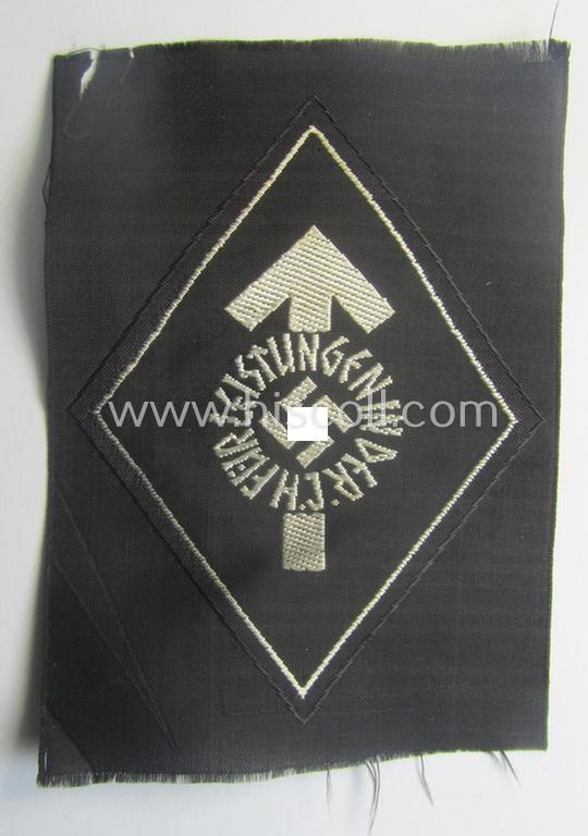 This is an attractive - and actually quite scarcely encountered! - HJ- (ie. 'Hitlerjugend'-) so-called: 'Leistungsabzeichen in Silber in Stoff' (or: cloth-based, silver-class youth sports'-badge) being a cloth-based version as was executed in the neat: 'BeVo'-weave pattern and that still retains its period-attached 'RzM'-etiket in place and that comes in an overall very nice- (ie. probably issued but I deem simply never used nor tunic-attached-), condition. The neat badge depicts a silverish-white-toned 'Leistungsrune' onto a black-coloured background and just shows some minimal (storage)age and/or staining. The piece can of course perfectly be mounted onto a HJ-tunic or shirt if wished so. Simply a neat - and truly fairly unusally encountered! - 'Hitlerjugend'-cloth-based, sports'-related patch of the bronze-class that will be hard to be upgraded!