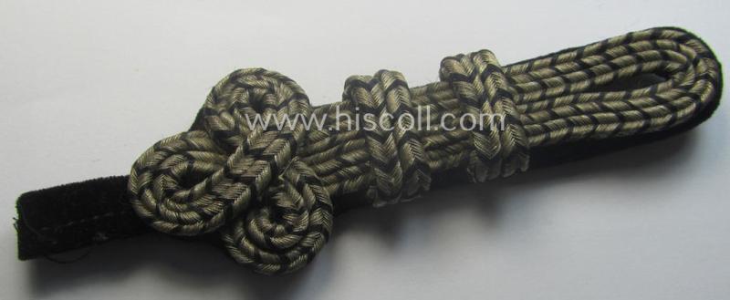 This is an attractive - regrettably single but nevertheless truly rarely found! - specific FAD (ie. 'Freiwilligen Arbeitsdienst') high-ranked, officers'-type shoulderboard (being of the pattern as was used in the period between 1932-36) as was intended for a: 'FAD-Gauarbeitsführer' and that comes in an overall nice- (ie. moderately used- and worn and/or clearly carefully tunic-removed-), condition. The neat (typically thin-shaped) board measures approx. 13 cms. in length and show a double (horizontally-mounted) 'loop' attached: it is executed in the typical, black-and-silverish-toned 'braid' and comes mounted onto a: 'velvet-like' woolen-based background (as can be seen on the pictures). The board comes in an overall nice- (ie. fully 'text-book') condition and still shows some of the thread- ie. stitching-remains with which it was once tunic-attached. These scarcely found (higher-ranked!) FAD-officers'-type shoulderboards (the FAD was in fact the predecessor of the RAD or: 'Reichsarbeitsdienst') were used by the officers serving within this organisation. This example originates from a larger-sized grouping of RAD- and/or FAD-insignia that was recently found at a private-household in Germany and that I acquired for the web-site. Simply a great occasion to acquire a desirable (and truly hard to find!) 'Freiwilligen Arbeitsdienst'-related, high-ranked officers'-type 'FAD-Schulterstück' for a justified price!