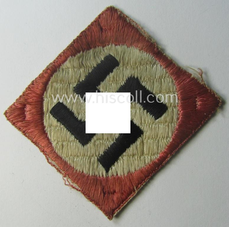 This is an attractive - and actually unusually seen! - example of an I deem most certainly 'pre-war'-period so-called: N.S.D.A.P.-related supporter-armpatch (ie. 'Ärmelabzeichen') being of an 'entirely woven'-pattern showing an interwoven ie. 'machine-embroidered' swastika and that comes in an overall nice- (ie. I deem once used- ie. worn-), condition. The linnen-based patch - that measures only 5 x 5 cms. - is constructed from bright-red- and white-coloured linnen and shows a neat (interwoven) 'roundel' that shows a black-coloured and interwoven ie. 'machine-embroidered' swastika (ie. roundel) as can be seen on the pictures. The unusual piece - which can be seen as some sort of period 'Nazi-Kitsch' - is truly very nicely made and does show obvious age ie. staining simply caused by decades of storage and/or moderate usage (as can be seen on the pictures). Simply an attractive N.S.D.A.P.-related 'supporter-item' that is accordingly priced!