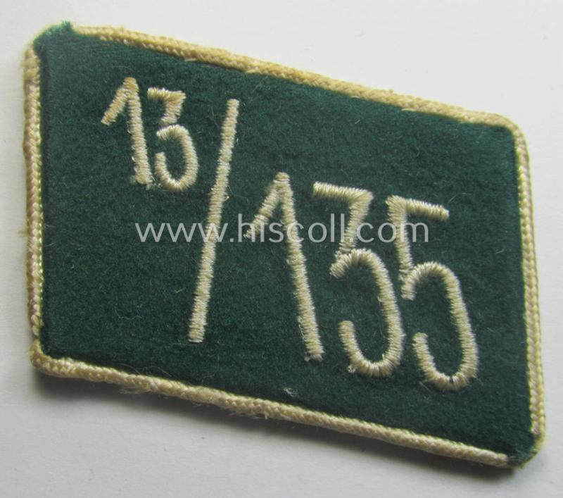 This is a neat - albeit regrettably single! - specific SA (ie. 'Sturmabteilungen') collar-patch (ie. 'Kragenspiegel') as executed in darker-green-coloured wool (and additionally piped in white cord ie. braid) as was (I deem) intended for usage by an: 'SA-Mitglied' serving within the: 'SA-Standarte 13/135' ('SA-Gruppe Kurpfalz o. Nordsee') being a just moderately used- (and/or I deem carefully tunic-removed-), example. The piece - that shows a typical 'buckram'-based 'backing' - comes in an overall very nicely preserved condition and shows the (white-toned) '13/135'-numerals (ie. cyphers or 'Ziffern') as executed in white-coloured linnen- or wool which are executed by means of so-called: 'Machinenstickerei': moreover, does this particular example still retains its period RzM-etiket glued onto its back (something that is not always the case) as can be seen on the pictures. This particular tab was found with various other SA-related cloth-insignia and was part of a grouping that was recently uncovered in the USA where it was brought after 1945 as a so-called: 'veteran-bringback'-lot. Simply a nicely preserved - and most certainly not that easily encountered! - SA-Kragenspiegel that belonged to an: 'SA-Mitglied' serving within the 'SA-Standarte 13/135' (belonging to the: 'SA-Gruppe Kurpfalz o. Nordsee') and that is I deem accordingly priced!