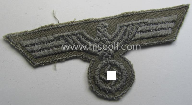 This is a neat - and with certainty never used- nor tunic-attached! - example of a later-war-pattern, WH (Heeres) breasteagle (ie. 'Brustadler für Mannschaften u. Unteroffiziere') being of the 'last-ditch'- (ie. later-war-period-) and neatly machine-embroidered-pattern and that comes in an overall very nice- (ie. 'virtually mint- ie. unissued'-), condition. These (somewhat roughly-embroidered) versions of the 'standard-pattern' army-type breasteagle were introduced in late 1944 ie. beginning 1945 and saw only limited usage. They are sometimes found on the - battle-dress like-model-, so-called: '1944-type' Heeres tunics. The piece on offer here comes in a simply never used example that just shows some minimal storage-age only (as can be seen on the pictures). Simply a neat - and not that easily encountered! - WH (Heeres) breast-eagle that comes in a truly wonderful condition!