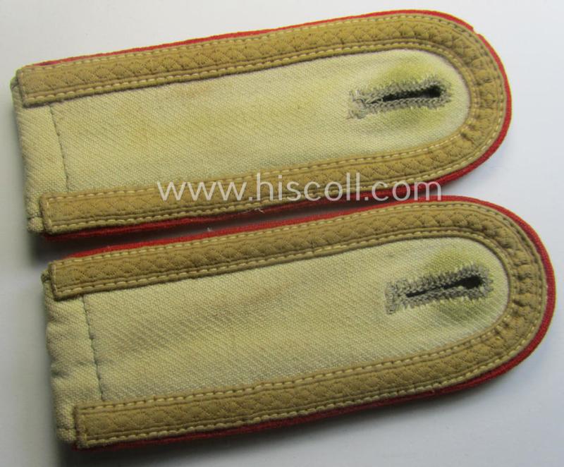 This is a truly very attractive - fully matching and actually very rarely encountered! - pair of truly early-war-period (ie. most certainly typical 'DAK'- or: 'Deutsches Afrika Korps'-related) pair of WH (Heeres) NCO-type, 'standard-issued'- and typical 'tropical'-pattern shoulderstraps (ie. 'Schulterstücke für Heeres-Tropenuniform') as piped in the neat bright-red (ie. 'hochroter'-) coloured branchcolour as was specifically intended for - and most certainly worn by! - an: 'Unteroffizier der Artillerie-Truppen' (or: junior-NCO ie. sergeant who served within the army artillery-troops) and that comes in an overall nice- (albeit just moderately used ie. clearly worn-), condition. The neat shoulderstraps - which are as stated above fully matching in execution and/or style - measure approximately 11,4 cms. in length each. Both straps have the typical brownish-tan- (ie. tropical!) coloured and/or linnen-based, 'upperdecks' (and typical earthen-green-coloured and woolen-based 'backings' as is more often encountered) and have the neat and desirable bright-red (ie. 'hochroter'-) coloured branchcolour and/or woolen-type piping and yellowish-brown-toned (ie. typical tropical-styled!) NCO-braid, period-attached denoting the NCOs-rank of an: 'Unteroffizier' (ie. junior-sergeant). The pair comes mounted onto its functional tongues and comes as most certainly worn and/or stored as such for decades. The pair was recently found at a private-household and was never before part of a collection. The neat pair was always together and was most certainly worn as such: is just a tiny bit dirty ie. stained and shows the clear evidence of having been moderately used and/or worn (it has clearly been faded due to obvious sunlight as can clearly be noticed on the pictures). It should be noted that all (genuine!) tropical- ie. 'DAK'-related- shoulderstraps are very hard to encounter and can easily be graded 'very rare': most of the pairs offered today are regrettably copies or fakes. I am aware of the fact that this insignia-set is highly priced something that is most certainly according to its unmistaken rarity and/or desirability!