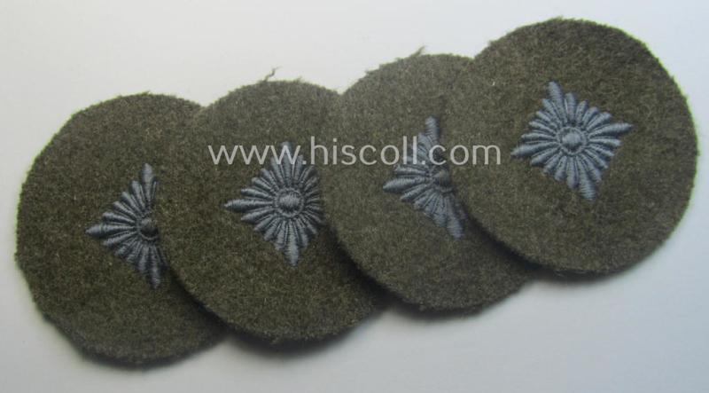 I recently found four - fully identical, early-period- and actually scarcely encountered! - examples of the WH (Heeres) 'standard-issue'-type, machine-embroidered, tropical-styled rank-insignia (ie. roundels) as was executed in bluish-grey coloured linnen onto a brownish-green-toned background as was intended for usage by an: 'Oberschütze' (ie. private first-class) and that come all four in an overall very nice- (I deem simply never used- nor once-tunic-attached-), condition. The pieces show some minimal age and/or staining simply caused by having been been stored as such for decades. The pieces - which are not maker-marked as more often seen - are not backed as can be seen onthe pictures: they were never before part of any collection and originate from a private-household. It sounds maybe strange but these simple tropical-style rank-badges are actually quite hard to encounter. My asking-price is naturally intended per single specimen. Simply a great occasion to acquire a neat tropical rank-badge as intended for a Heeres-soldier having the rank of an: 'Oberschütze'!