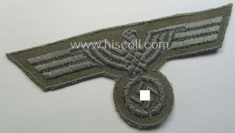 This is a neat - and with certainty never used- nor tunic-attached! - example of a later-war-pattern, WH (Heeres) breasteagle (ie. 'Brustadler für Mannschaften u. Unteroffiziere') being of the 'last-ditch'- (ie. later-war-period-) and neatly machine-embroidered-pattern and that comes in an overall very nice- (ie. 'virtually mint- ie. unissued'-), condition. These (somewhat roughly-embroidered) versions of the 'standard-pattern' army-type breasteagle were introduced in late 1944 ie. beginning 1945 and saw only limited usage. They are sometimes found on the - battle-dress like-model-, so-called: '1944-type' Heeres tunics. The piece on offer here comes in a simply never used example that just shows some minimal storage-age only (as can be seen on the pictures). Simply a neat - and not that easily encountered! - WH (Heeres) breast-eagle that comes in a truly wonderful condition!