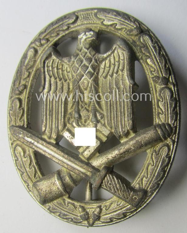 This is an attractive - and I deem only moderately used ie. worn - example of an: 'Allgemeines Sturmabzeichen' (or: General Assault Badge ie. GAB) being a non-maker-marked, zinc- (ie. 'Feinzink'-) based so-called: 'flat-back, long-barrel-hinge'-variant as was executed in (typical silverish-toned) zinc-based metal (ie. 'Feinzink') and that was produced by the: 'Steinhauer & Lück'- (ie. 'S.& L.'-) company as based in town of Lüdenscheid and that comes in an overall very nice- (albeit - I deem - moderately used- and/or worn-), condition. This example is a typical non-maker-marked award as more often encountered: it has a 'typical' so-called: 'long-sized-barrel'-pattern pin-set-up and shows an elongated hinge-set-up (as is more often seen on GABs as produced by the: 'S.& L.'-company). The badge seems to be totally uncleaned and has still an attractive and/or only minimally 'tarnished' age-patina: a fair bit of its period-applied finish has been nicely preserved (as is not always the case). The pin and/or catch (ie. set-up-) are of course fully functional and present. The piece - which originates from a private-household in Germany where it was recently found - shows some minimal wear and/or staining but was with certainty never cleaned. Simply a nice - and honest! - 'Feinzink'-based, GAB that was produced by the: 'Steinhauer & Lück'-company and that is (I deem) accordingly priced!