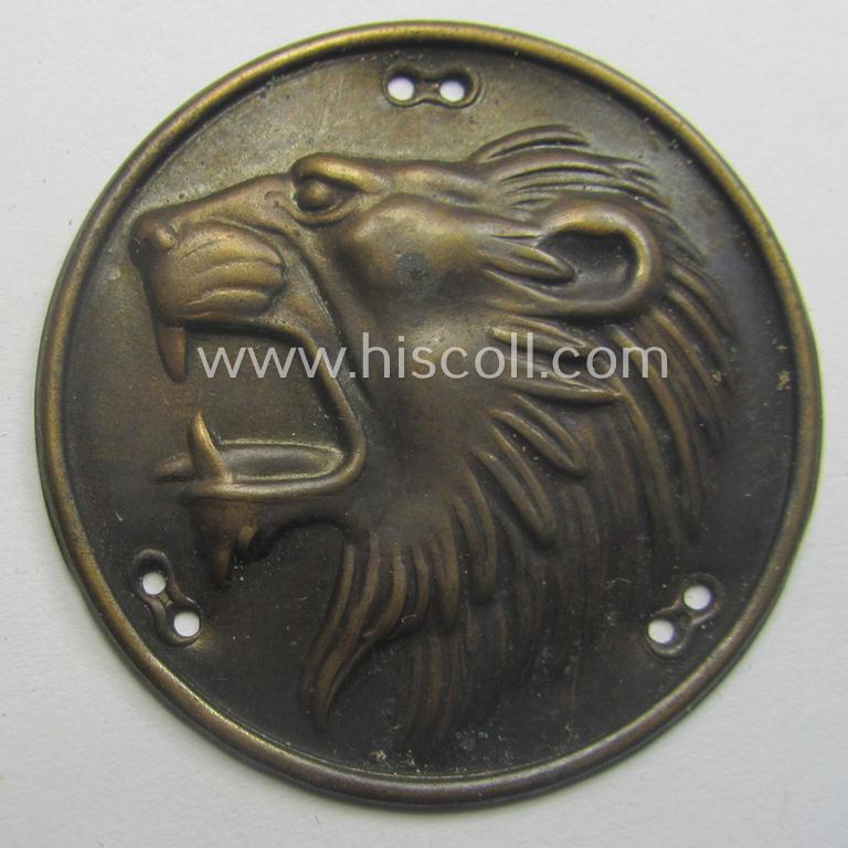 This is a very attractive - and actually truly scarcely encountered! - so-called: 'Freikorps'- (ie. 'Ritter von Epp'-) related sleeve-diamond device (ie.: 'Auflage für den Ärmelraute') showing a very detailed illustration of a lions-head (ie. 'Löwenkopf') and that comes in an overall very nice- (ie. I deem just moderately used- and/or carefully tunic-removed-), condition. The piece is executed in golden-bronze-toned metal (I deem non-magnetic so-called: 'Buntmetall') and is truly very detailed and pronounced (as can be noticed on the pictures). These device were normally worn on a black- (ie. darker-blue) toned and/or woolen-based 'Raute'. These attractive Bavarian-related sleeve-diamonds (ie.: 'Ärmelrauten') were worn by the various 'Freikorps Ritter von Epp'-volunteers during the period between 1919 and 1925. Simply a an attractive - and truly scarcely seen! - early-period piece of 'Freikorps'-related insignia: only the second such interesting 'Freikorps-Raute Auflage' I ever had on offer!