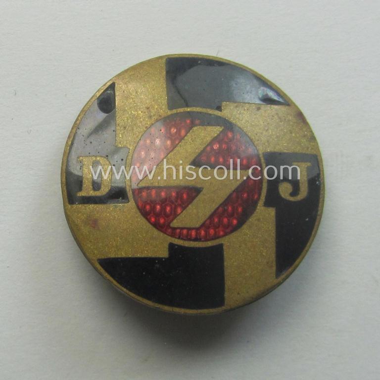 The attractive - I deem somewhat early-period and truly worn! - youth-related membership-lapel-pin (ie. 'Mitgliedsabzeichen') shows some regular wear, age and/or minimal staining but has a totally undamaged- and/or neatly enamelled (and totally undamaged!) surface. It has never been cleaned and retains a really attractive- and only minimally tarnished age-patina. The neat pin - which comes mounted onto its functional and fully unaltered pin-/catch set-up - is also figured in the Heering-Hüsken 'Abzeichen'-catalogue wherein it is given a unique reference-number (9269A). The piece is a neat example of the 1st pattern: something that is easily recognisable due to the fact that it depicts the text: 'D.J.' (instead of: 'D.J.V.') as can be noticed on DJ-badges of the second pattern). The pin is void of an 'RzM'-makers'-designation but does show a typical patent-pending- (ie. 'Ges.Gesch.' -) designation on its back (as can be seen on the pictures). The (somewhat smaller-sized) piece has an approximate diameter of only 2,2 cms. (as can be noticed on the pictures). I deem that this attractive - and early-period! - DJ-lapel-pin of the first-pattern is with certainty accordingly priced!