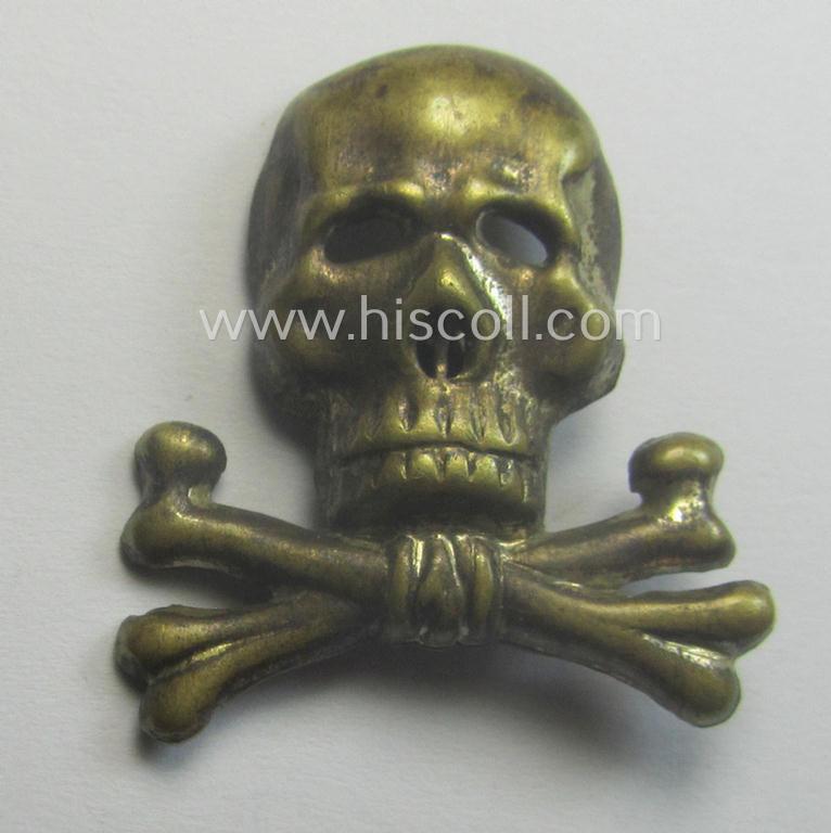 This is an attractive - and actually quite scarcely encountered! - so-called: 'Truppentraditionsabzeichen' (ie. 'Braunschweiger Traditions-Totenkopf für die Schirmmütze des Infanterie-Regiments 17 und Kavallerie-Rgts. 13) being a detailed example as was executed in silverish-grey-coloured (and I deem) 'Buntmetall'-based metal and that comes in an overall very nice- (ie. I deem just moderately used- and clearly once visor-cap attached-), condition. The piece - which is totally void of any makers'-designation as more often - came mounted on both its (still fully functional) copper-toned prongs (as can be seen on the pictures). The piece is just a tiny bit stained- ie. dirty but was never cleaned nor polished. Simply a very attractive - and naturally 100% genuine! - 'Truppentraditionsabzeichen' (ie. 'Braunschweiger Traditions-Totenkopf') that is with certainty accordingly priced!