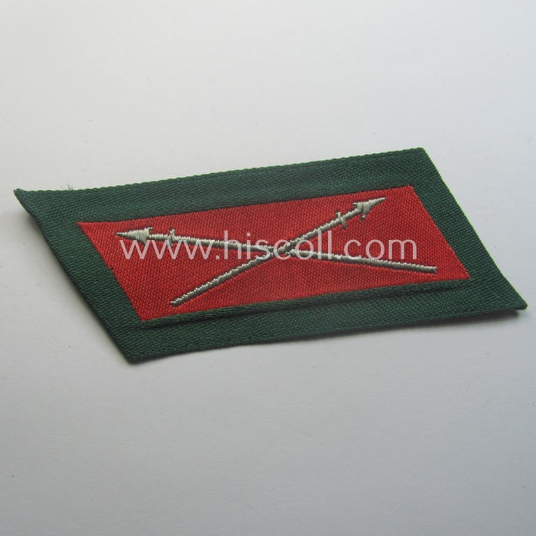 The truly very attractive - albeit regrettably single but nevertheless still very rarely found! - specific enlisted-mens'- (ie. NCO-) pattern collar-patch (ie. 'Kragenspiegel für Mannschaften u. Unteroffiziere der Kosaken') is executed in the (typical) 'BeVo'-weave pattern and is depicting the typical (upright-positioned) 'crossed-spear'-devices on a bright-red- ie. darker-green-coloured background (as was specifically intended for usage by the Russian volunteers ie. troops serving within the various German-led 'Cossack'-units) and that comes in an overall very nice- (ie. simply never worn- nor tunic-attached- ie. 'virtually mint- ie. unissued'-), condition. This particular example just shows some minimal storage-age. These - original - 'official' and German-produced 'Cossack'-related collar-tabs as executed in 'BeVo'-type weave (ie. German manufacture by the company of 'BeVo') can be easily considered 'exceedingly rare' and come not that often for sale: this just the second such example I did ever encountered. Too bad that it is only a single piece but I deem that I have, nevertheless, priced this very attractive example according to its unmistaken rarity and/or desirability!