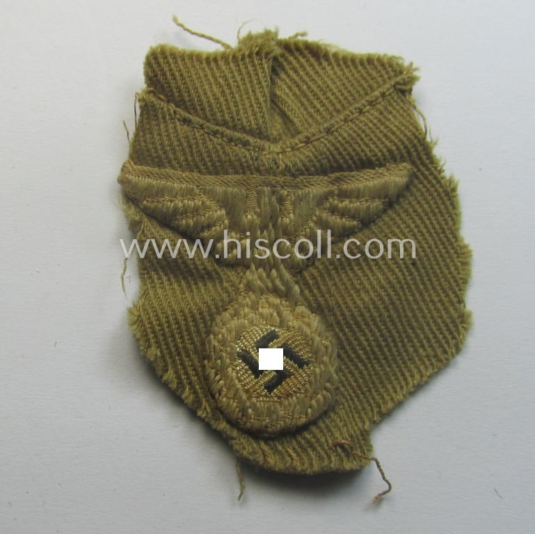 This is an attractive - and unusually 'cut-out'! - example of a: HJ (ie. Hitlerjugend), typical beige- (ie. tan-) coloured, so-called: 'M34'-pattern side-cap-eagle (ie. 'Schiffchen o. Sommermützen-Adler nach Vorschrift der RJF') that comes in a just moderately worn- (albeit still nicely preserved-), condition. The neat piece was recently found in the USA and was truly never in collectors'-hands: it was brought to the US by a veteran who saved this as a souvenir. It came still mounted onto a tiny piece of a side-cap and was carefully cut-out of a cap (as can be noticed on the pictures). Simply an attractive - unusually seen and fully untouched! – early-pattern 'Adler fürs Schiffchen o. Sommermütze nach Vorschrift der RJF' that is with certainty accordingly priced!