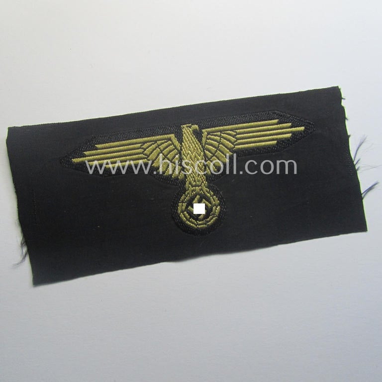 This is a very attractive example of a mid- (ie. later-) war-pattern, 'SS' (ie. 'Waffen-SS') so-called: 'BeVo-weave-style', enlisted-mens'- (ie. NCO-pattern) tropical-styled arm-eagle (ie. 'Tropen-Ärmeladler für Mannschaften u. Unterführer der Waffen-SS') as was intended for usage by the various Waffen-SS troops throughout the war that comes in an overall very nice- (ie. possibly issued- albeit nevertheless still 'virtually mint'- and/or most certainly never tunic-attached-), condition. The neat and desirable piece - which shows the machine-embroidered- and/or truly golden-yellow-coloured stitching on a black-coloured- and/or linnen-based background - shows some mimimal age ie. staining caused by decades of storage only. The eagle is a 'text-book' example of a so-called: tropical 'BeVo-woven'-type, arm-eagle (that was - amongst others - used on the camouflaged, M44-type, Waffen-SS 'Dot'-pattern tunics and Italian-styled 'Sahariana'-tunics). The piece comes without a paper-based 'RzM'-etiket: I deem it had once one attached (something that is more often seen). Simply a very nice - and of course 100% guaranteed original! - tropical-style Waffen-SS arm-eagle which will be impossible to be upgraded!