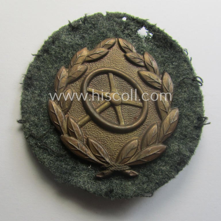 WH (Heeres o. Waffen-SS) so-called: 'Kraftfahrbewährungs-Abzeichen in Bronze' (or: bronze-class drivers'-proficiency-badge) that comes mounted onto its piece of field-grey-coloured wool as most certainly issued- and/or clearly worn, condition