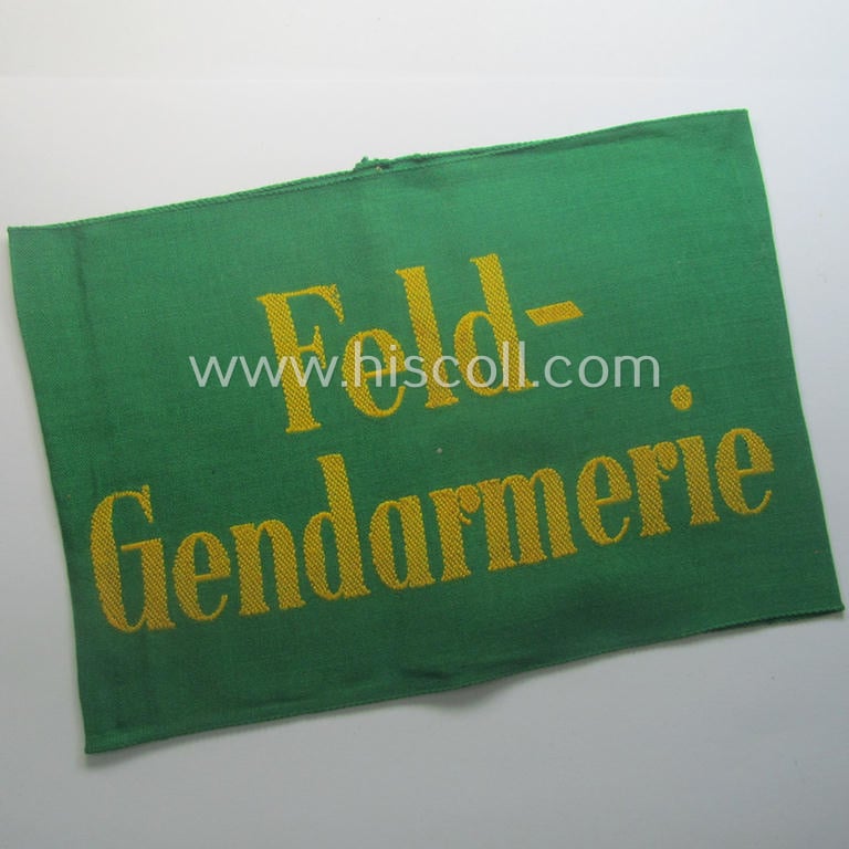 Wehrmacht-related, bright-green-coloured and/or linnen-based armband entitled: 'Feldgendarmerie' (as was specifically intended for usage by the staff of the notorious: 'Feldgendarmerie-Truppen')