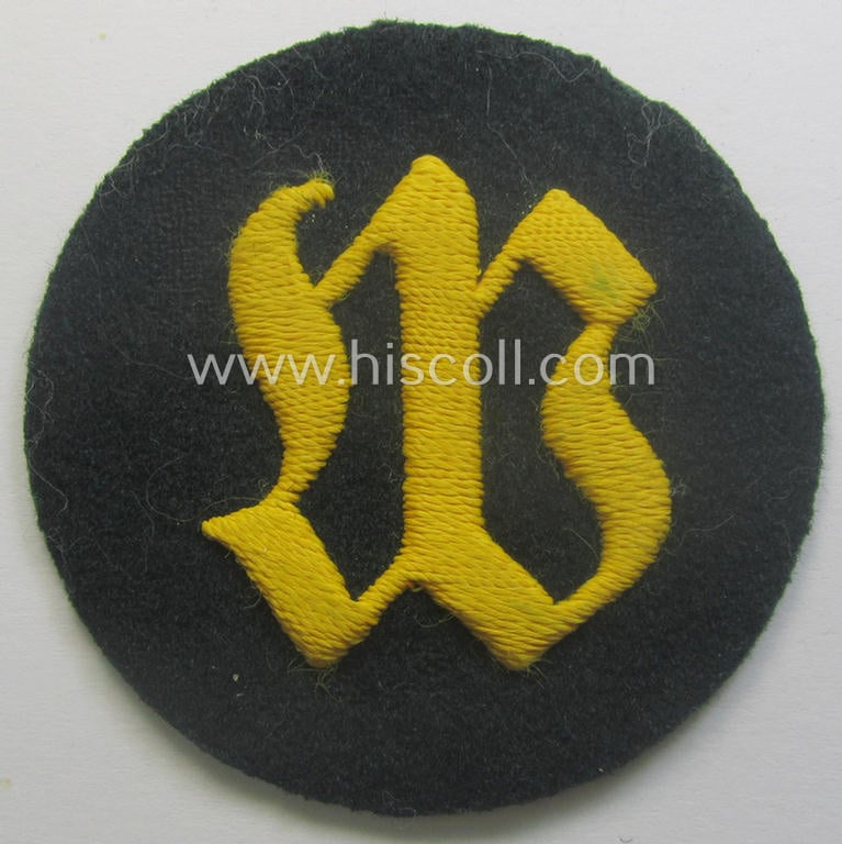 This is a truly attractive - and with certainty very scarcely encountered! - example of a WH (Heeres) so-called: trade- and/or special-career arm-insignia (or: 'Laufbahn- o. Tätigkeitsabzeichen') as was specifically intended for an army: 'Wallmeister' (or: fortification-construction NCO) that comes in an overall very nice- (I deem just minimally worn- ie. presumably once-tunic-attached-), condition. The neat patch is executed on a darker-green-coloured- and/or woolen-based background and shows the (Gothic-styled, very detailed and/or neatly hand-embroidered) 'W'-character as executed in bright-yellow-coloured linnen. The maker-marked patch is nicely backed with greyish-coloured linnen as is more often encountered and does show some minimal carton-remains on its back simply caused by having been glued in an album or scrapbook once (as can be seen on the pictures). The patch shows some minimal age and/or staining simply caused by decades of storage and minimal wear. This particular example originated from a larger cloth- and/or shoulderstrap-collection I recently acquired for the web-site. Simply a very attractive WH (Heeres) trade- ie. specialist badge: one of the more difficult to encountered specimen of the extensive series!