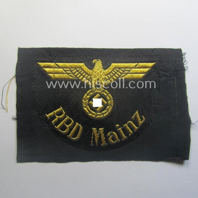 This is a neat example of a linnen-based arm-eagle (ie. 'Ärmeladler') as executed in the so-called: 'BeVo'weave style, as was intended for usage by an official of the: 'Deutsche Reichsbahn' ie. of the: 'RBD Mainz' (or: 'Reichsbahndirektion Mainz') and that comes in an overall very nice- (ie. 'virtually mint- ie. unissued'-) condition. These attractive eagles - as woven in golden-yellow linnen on a black-coloured- and also linnen-based background - were worn on the darker-blue-coloured service-tunics and/or uniforms of the various officials within this organisation. This is a special arm-insignia-piece, that was intended for the staff working at one of the occupied railway-centres. There were several of these railway-related centres (= 'Reichsbahndirektionen' or RBD) throughout Europe. This is a piece that was intended for a member of the: 'RBD (= 'Reichsbahn-Direktion') based in the German town of Mainz. The piece - showing a left-facing eagle as to be expected - comes in a 'mint- ie. unissued'- and/or never tunic-attached condition: it is a tiny bit stained caused by decades of storage only. This piece originates from a larger collection of various RB- ('Reichsbahn'-) related arm-eagles that was compiled over many years and that I recently acquired for the website. Simply a nice - and not that commonly encountered! - 'Deutsche Reichsbahn'-related arm-eagle!
