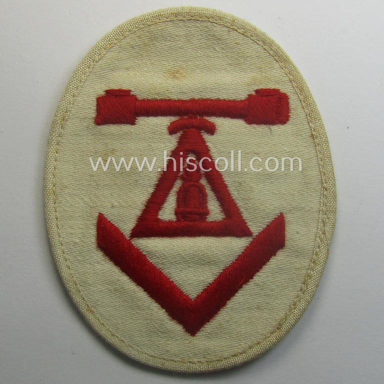 This is an attractive - I deem never used- nor tunic-attached and actually scarcely encountered! - WH (Kriegsmarine) neatly machine-embroidered, so-called: career- ie. specialist-armbadge (ie. 'Tätigkeits-Abzeichen') as executed in multi-coloured linnen onto a typical beige-white-coloured (and linnen-based) backing as was specifically intended to signify participation in the: 'Entfernungsmesser mit Seeziel u. Fla. E.Meßausbildung' (ie. specific training-course on the usage on anti-aircraft 'Entfernungsmesser') and that comes in an overall very nice, condition. The badge - which was to be mounted on the upper-arm-regions of the various white-coloured, naval-tunics - depicts a detailed and bright-red-coloured 'Entfernungsmesser'-device and triangle coupled with a single rank-chevron (as can be seen on the pictures). The badge is executed in bright-red-coloured linnen onto a beige-white-coloured and/or typical, linnen-based background. The piece does show extraordinary craftmenship and is additonally 'backed' (and does show an additionally-added 'rim' as more often seen). The piece just shows some minimal age and/or staining simply caused by decades of storage only. It sounds maybe strange but all WH (Kriegsmarine) career- ie. specialist-armbadges as specifically related to the various naval 'Entfernungsmesser'-units are truly hard to encounter and can easily be graded 'scarce'. Simply a very attractive example that is I deem with certainty accordingly priced!