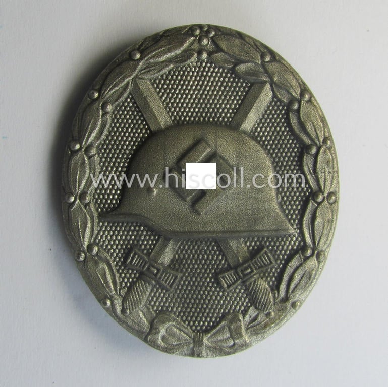The truly attractive - just minimally used albeit typical zinc- (ie. 'Feinzink'-) based - silver-class wound-badge (or: 'Verwundeten-Abzeichen in Silber') shows only minimal age and wear and still retains almost all of its original, silverish-grey-coloured- (ie. typical zinc-like-) finish: it just shows some minimal wear and/or age (as can be seen on the pictures). The badge is as stated neatly maker-marked with the super-imposed makers'-designation: '65' on its back (as can be seen on the pictures) signifying that it deals with a typical piece as was produced by the: 'Klein u. Quenzer'-company as based in the town of Oberstein a.d. Nähe. Of course, are the (regular- ie. thin-shaped-) pin and/or (typical molded) catch (-set-up) fully functional and of course present. This piece has never been cleaned nor polished: it shows some minimal age, dust and/or staining as to be expected. Simply a very nicely preserved and just minimally worn example that is I deem accordingly priced!