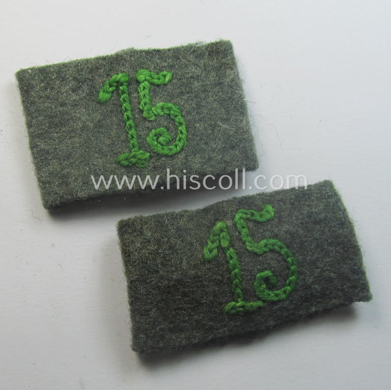 This is an attractive - fully matching and scarcely found! - pair of WH (Heeres) 'Grenadiere'-related, so-called: regimental shoulderstrap-'slip-ons' (ie. 'Schulterstück-Überschuben') as was intended for usage by a: 'Soldat des Grenadier-Regiments 15' and that comes in a wonderful- (and I deem simply never worn- nor used-), condition.The pair is neatly 'machine-stitched'-embroidered (by means of so-called: 'Kurbelstickerei') in the typical bright-green- (ie. 'hell- o. wiesengrüner'-) coloured wool and does show some minimal storage-age only. Simply an attractive pair of 'Grenadiere'-related- (ie. later-war infantry-) related 'Überschuben' that is - I deem - accordingly priced: great to 'decorate' a pair of 'hellgrüner'-piped 'Heeres'-shoulderstraps or ideally fitted to keep in any insignia-collection!