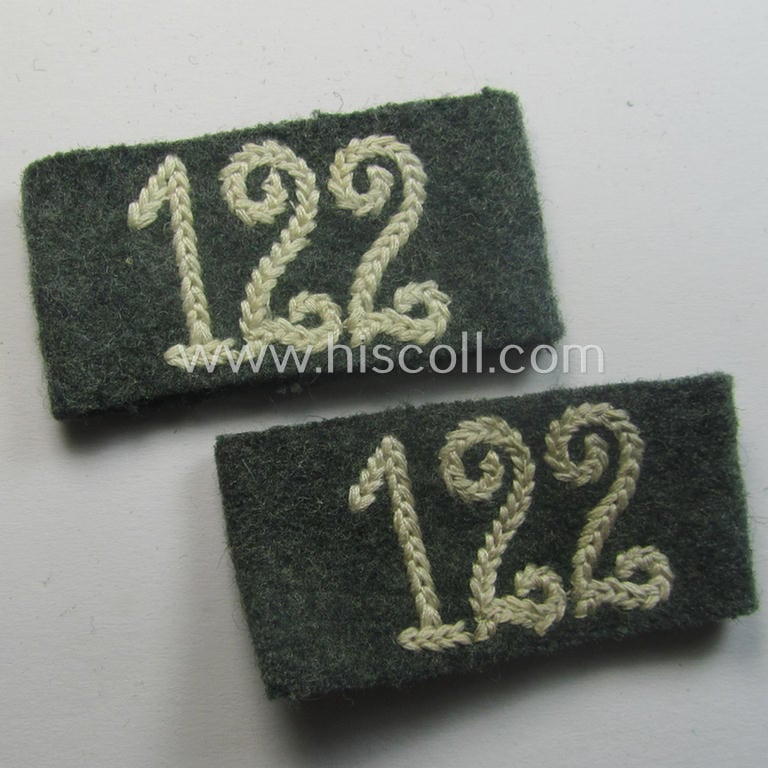This is an attractive - truly matching and/or fully identical! - pair of WH (Heeres) 'Infanterie'-related, so-called: regimental shoulderstrap-'slip-ons' (ie. 'Schulterstück-Überschuben') as was specifically intended for usage by a: 'Soldat des Infanterie-Regiments 122' and that comes in an overall very nice- (and I deem simply never worn- nor used- ie. still 'virtually mint unissued'-), condition. The pair is neatly 'machine-stitched'-embroidered in the typical white- (ie. 'weisser'-) coloured wool by means of so-called: 'Kurbelstickerei' as to be expected. Simply a nice opportunity to aquire an attractive pair of 'Infanterie'-related 'Überschuben' that is - I deem - accordingly priced: great to 'decorate' a pair of 'weisser'-piped 'Heeres'-shoulderstraps or ideally fitted to keep in any insignia-collection!