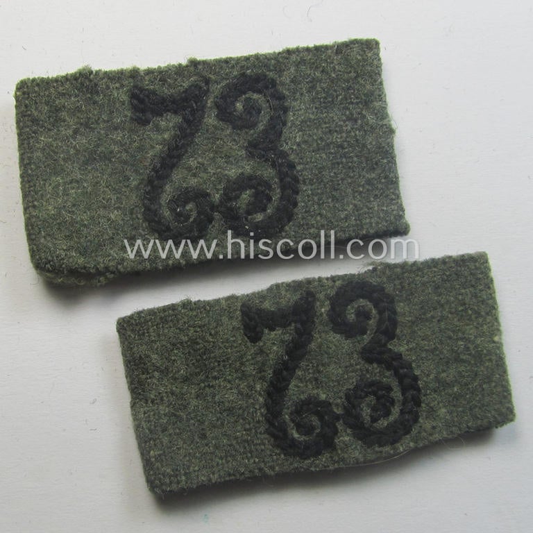 This is an attractive - fully matching and scarcely found! - pair of WH (Heeres) 'Pioniere'-related, so-called: regimental shoulderstrap-'slip-ons' (ie. 'Schulterstück-Überschuben') as was intended for usage by a: 'Soldat des Pionier-Abteilungs 73' and that comes in a wonderful- (and I deem simply never worn- nor used-), condition.The pair is neatly 'machine-stitched'-embroidered (by means of so-called: 'Kurbelstickerei') in the typical black- (ie. 'schwarzer'-) coloured wool and does show some minimal storage-age only. Simply an attractive pair of 'Pioniere'-related- (ie. army-engineers-) related 'Überschuben' that is - I deem - accordingly priced: great to 'decorate' a pair of 'schwarzer'-piped 'Heeres'-shoulderstraps or ideally fitted to keep in any insignia-collection!