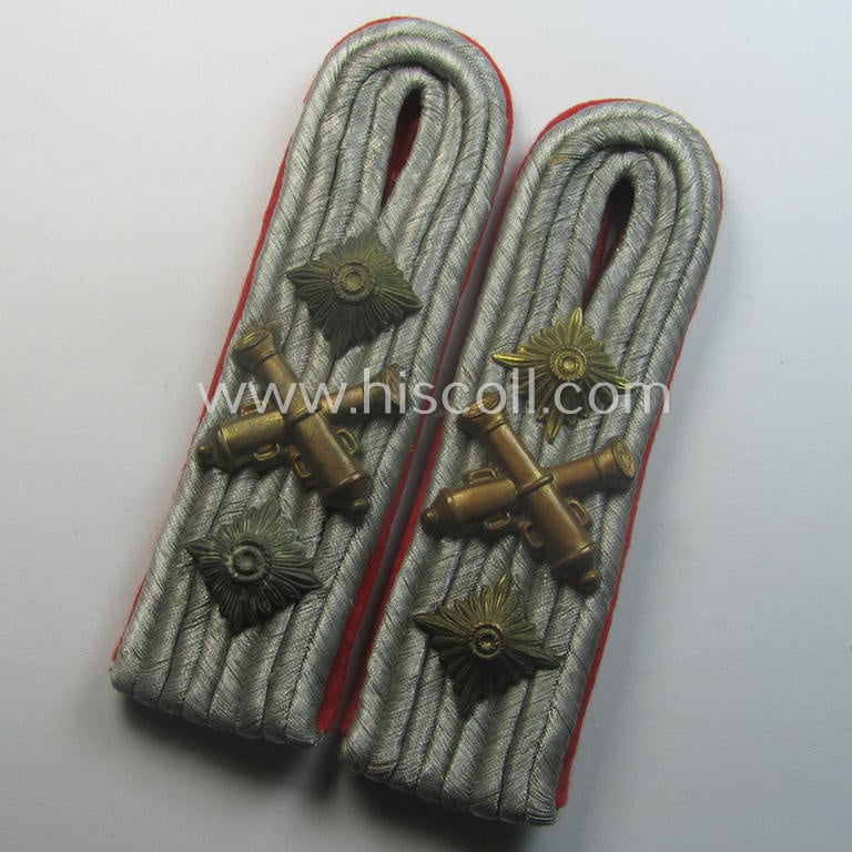 Fully matching - and actually scarcely encountered! - pair of WH (Heeres) neatly 'cyphered'- (and bright-red-piped!) officers'-pattern shoulderboards as specifically intended for a: 'Hauptmann u. Waffenoffizier der Artillerie-Trpn.'