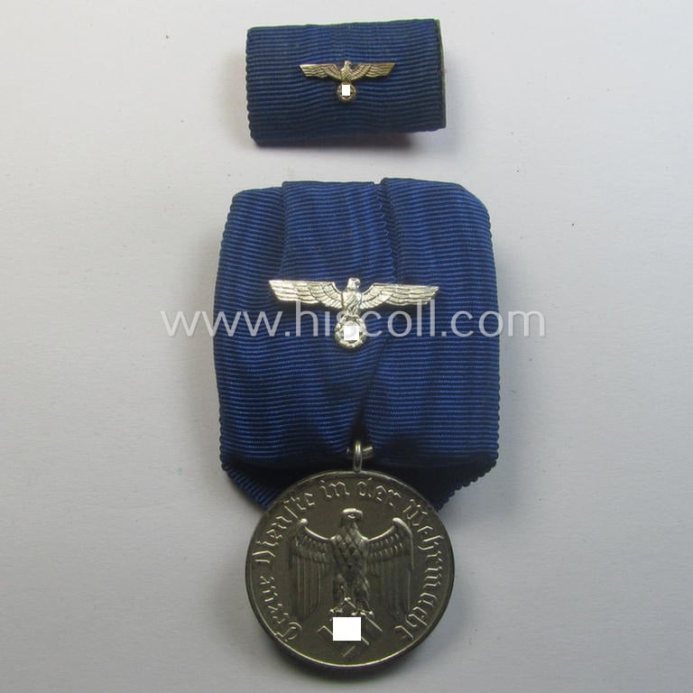 Silver-toned WH (Heeres o. KM) so-called: 'Einzelspange' showing a: 'WH-Dienstauszeichnung 4. Stufe' (as was intended for 4 years of loyal-service) and that shows a detailed, Heeres o. KM-type-eagle-device, period-attached