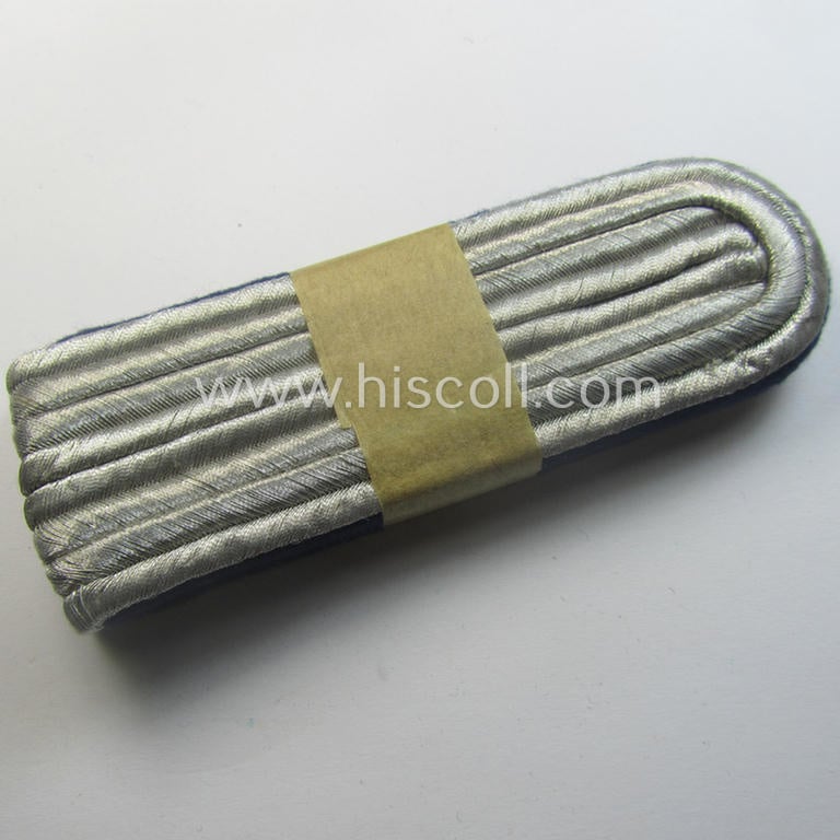 The attractive pair is piped in the darker-blue- (ie. 'blauer'-) coloured branchcolour: as such, the pair was intended for usage by a junior officer ie. 'Leutnant u. Arzt' (ie. lieutnant and/or junior medical-doctor) who served within the: 'Luftwaffe-Sanitäts-Truppen' (or: airforce-related, medical-troops). The pair was simply never used nor tunic-attached: it comes in an overall very nice- (ie. simply 'virtually mint'-), condition. The shoulderboards - which are constructed from the darker-blue- (ie. 'blauer'-) coloured, 'smooth-type' (ie. moleskin-like-) wool - come in an excellent condition overall and will be impossible to be upgraded (the pair is fully matching and comes still 'tied-together' with a paper-based 'Banderolle' as found as can be seen on the pictures). The fairly 'shiny' appearance of the 'upperdecks' is fully present and/or preserved (something that is to be expected with a Luftwaffe-related pair). The boards are just a tiny bit 'tarnished' by normal age and/or storage for decades (as can be seen on the pictures). The boards - which measure approximately 10,6 cms. in length each - come mounted onto their period (thin-shaped) tongues. This pair originated from a small lot of LW-straps and boards that I recently acquired for the web-site: it originated from the left-overs of a tailor-shop. Simply a great occasion to acquire an attractive, officers'-type, LW-shoulderstrap-pair that was intended for an: 'Leutnant u. Arzt der Sanitäts-Truppen'!