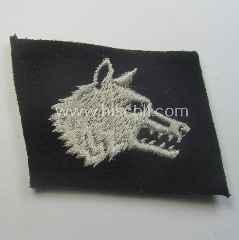 This is a truly attractive example of a Waffen-SS, so-called: 'RzM'-styled, enlisted-mens'- (ie. NCO-) type collar-tab depicting the typical 'wolfshead'-insignia as was (presumably) specifically intended for usage by soldiers (ie. NCOs) serving within the: 'Osttürkischer Waffen-Verband der SS' and that comes in an overall very nice- (ie. 'virtually mint- ie. unissued'- and/or simply never tunic-attached-), condition. This collar-tab ranks amongst the rarest specimen of the extensive series and is as stated above never used nor worn (it originated with certainty from one of the Dachau clothing-depots and originates from the USA where it was stored for decades as a so-called: 'veteran bring-back'-item). The collar-tab - which is excuted in greyish-white-coloured linnen on a black-coloured and/or woolen- (ie. 'smooth'-type ie. 'moleskin'-based-) background - has a 'standard'-pattern- and/or beige-coloured- and/or 'buckram'-based backing that shows a tiny moth-bite (as can be noticed on the pictures). The tab does show the white-coloured stitching on its back as is more often encountered. Simply a 100% garuanteed original SS collar-tab that was intended for a specific group of volunteers and that is missing from many collections: hard to find a more attractive example for a more interesting price!