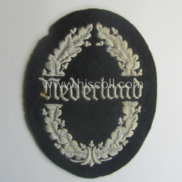 This is a very attractive - and truly exceedingly rarely encountered! - example of a so-called: 'Werkdienst Nederland' (ie. being a Dutch SS-related organisation that can be translated as 'workforce Netherlands' which was mainly tasked with bunkerbuilding) arm-patch (ie. 'Ärmelabzeichen') being an attractive and detailed, machine-embroidered example that was presumably intended for enlisted-mens'- (ie. NCO-) usage and that comes in an overall very nicely preserved- (and I deem simpy never used- nor worn-), condition. The attractive badge - which is executed in silverish-greyisch-coloured thread on a typical, black-coloured- and/or felt-woolen-based background - measures approximately: 9 x 7 cms. and shows the wording: 'Nederland' surrounded by an oakleave 'wreath' (as can be seen on the pictures). The piece was presumably issued but was - I deem - never worn nor tunic-attached: it comes in a truly very nicely preserved condition without showing any defaults (as can be seen on the pictures). These neat armpatches are truly execeedingly rare: I only know a handful of other period examples that are in collections today. In my personal collection I also have a photo wherein such patch is worn by a Dutch volunteer: of interest is naturallly the fact that they were simply attached over the SS-arm-eagle (as can be noticed on my attached photo). The 'Werkdienst Nederland'-arm-badge on offer here originates from an advanced collection of NSB- ie. Dutch collaboration-related items that I recently acquired for the web-site. Simply a very attractive - and truly exceedingly rarely found! - 'Werkdienst Nederland'-related arm-badge that is with certainty accordingly priced: only the first such neat Dutch SS-related cloth item I ever had on offer!