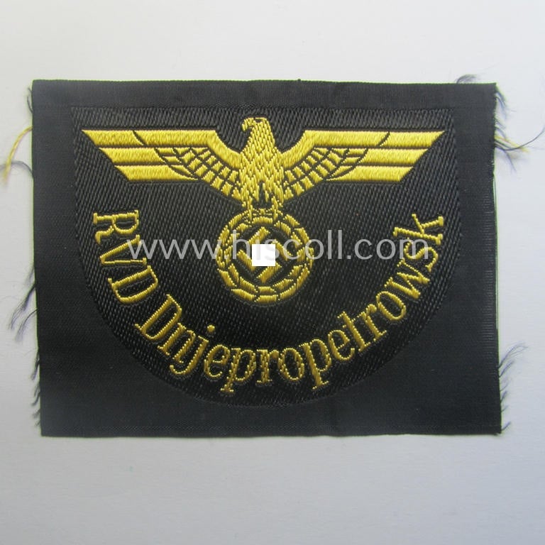 This is a neat example of a linnen-based arm-eagle (ie. 'Ärmeladler') as executed in the so-called: 'BeVo'weave style, as was intended for usage by an official of the: 'Deutsche Reichsbahn' ie. of the 'RVD Dnjepropetrowsk' (or: 'Reichsverkehrsdirektion Dnjepropetrowsk') and that comes in an overall very nice- (ie. 'virtually mint- ie. unissued'-) condition. These attractive eagles - as woven in golden-yellow linnen on a black-coloured- and also linnen-based background - were worn on the darker-blue-coloured service-tunics and/or uniforms of the various officials within this organisation. This is a special arm-insignia-piece, that was intended for the staff working at one of the occupied railway-centres. There were several of these railway-related centres (= 'Reichsverkehrsdirektionen' or RVD) throughout Europe. This is a piece that was intended for a member of the: 'RVD (= 'Reichsvekehrs-Direktion') based in the town of Dnjepropetrowsk. The piece - showing a left-facing eagle as to be expected - comes in a 'mint- ie. unissued'- and/or never tunic-attached condition: it is a tiny bit stained caused by decades of storage only. This piece originates from a larger collection of various RB- ('Reichsbahn'-) related arm-eagles that was compiled over many years and that I recently acquired for the website. Simply a nice - and not that commonly encountered! - 'Deutsche Reichsbahn'-related arm-eagle!