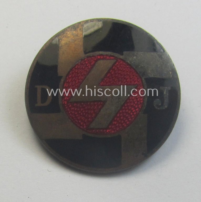 The attractive - and truly worn! - youth-related membership-lapel-pin (ie. 'Mitgliedsabzeichen') shows some regular wear, age and/or minimal staining but has a totally undamaged- and/or neatly enamelled (and totally undamaged!) surface. It has never been cleaned and retains a really attractive- and only minimally tarnished age-patina. The neat pin - which comes mounted onto its functional and fully unaltered pin-/catch set-up - is also figured in the Heering-Hüsken 'Abzeichen'-catalogue wherein it is given a unique reference-number (9269A). The piece is a neat example of the 1st pattern: something that is easily recognisable due to the fact that it depicts the text: 'D.J.' (instead of: 'D.J.V.') as can be noticed on DJ-badges of the second pattern). The pin shows a clearly present 'RzM-No.9'-makers'-designation but is void of a patent-pending- (ie. 'Ges.Gesch.' -) designation on its back (as can be seen on the pictures). The (somewhat larger-sized) piece has an approximate diameter of only 2,6 cms. (as can be noticed on the pictures). I deem that this attractive - and early-period! - DJ-lapel-pin of the first-pattern is with certainty accordingly priced!