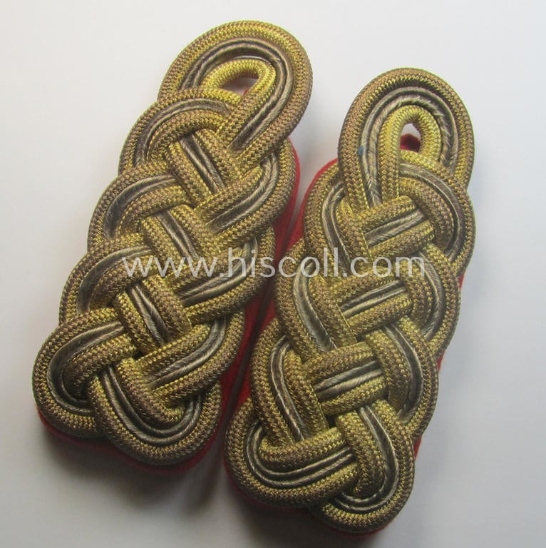 This is a truly very attractive - very desirable and fully matching! - pair of (I deem somewhat early-war-period and I deem hardly worn!) pair of WH (Heeres) general-officers'-pattern shoulderboards (ie. 'Schulterstücke für Generale des Heeres') as was intended for a general-officer holding the rank of a: 'Generalmajor' (ie. brigadier general) and that comes in an overall very nice- (ie. presumably issued- albeit hardly worn- ie. used-), condition. The neat shoulderboards - which both show an 'upperdeck' that is executed in golden- and/or silver-coloured- (ie. I deem somewhat early-war-type) 'braid'-based material - measure approx. 11,8 cms. in length each and show a bright-red-coloured- and/or 'smooth'-woolen-based 'underground' as to be expected. The boards come mounted onto their smaller-sized tongues attached (as can be noticed on the pictures). The boards never had any pips (nor numerals) attached and was thus a pair that was intended for a general-officer with the (lowest) general-officers' rank of a: 'Generalmajor des Heeres'. The boards show truly extraordinary detail and are a great example of the employed craftmenship of the days. The pair is just a tiny bit tarnished ie. stained (simply caused by years of storage ie. minimal wear). The pair belonged to an (regrettably unidentified) army 'General' who kept and/or stored these neat insignia-pieces for decades. Simply a very attractive and/or truly detailed WH (Heeres) general-officers'-type shoulderboard-pair that is with certainty priced according to its desirability and obvious rarity!
