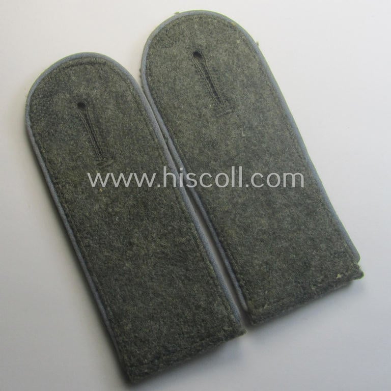 This is an attractive - fully matching and (I deem) early- ie. mid-war-period! - pair of 'standard-issued'-pattern, WH (Heeres) 'M41'- ie. 'M43'-pattern), enlisted-mens'-type shoulderstraps (ie. 'Schulterstücke für Mannschaften des Heeres') as was piped in the desirable light-blue- (ie. 'kornblumenblauer'-) coloured branchcolour as was specifically intended for usage by a: 'Soldat eines Nachschub-Abteilungs' (or: simple soldier who served within one of the army transport units) and that comes in an overall very nice- (ie. I deem just minimally used- ie. worn-), condition. The neat straps - which have the 'standard'-pattern, field-grey-coloured and/or typical 'smooth woolen'-based 'upperdecks' and that measure approximately 11,5 cms. in length each - show the neat light-blue- (ie. 'kornblumenblauer'-) coloured and/or (desirable) 'silk-like'-type piping attached (as can be seen on the pictures). The pair comes naturally mounted onto their period-attached- (regular-shaped) tongues attached and comes in a very nice- (ie. fully 'text-book') condition overall (as can be seen on the pictures). These type of shoulderstraps are of the early-war-period pattern straps and were worn in the period around 1941 (and were 'worn-out' even during the rest of the war). The pair only shows minimal wear and/or age and is just nicely preserved over the years (as can be seen on the pictures). I deem this an excellent occasion to acquire a neat - and most certainly desirable! - EM-type, 'Nachschub'-related, Heeres-EM-type shoulderstrap-pair for a justified price!