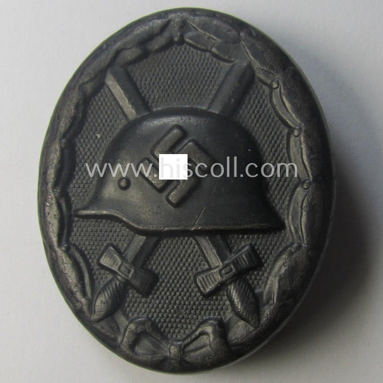 The attractive - albeit moderately used- and/or worn - black-class wound-badge (ie. 'Verwundeten-Abzeichen in Schwarz') truly retains most of its original, black-coloured- and/or somewhat 'shiny'- (ie. glossy-like-) finish: it only shows moderate wear and was simply nicely preserved over the years. The (magnetic) wound-badge is - as stated above - neatly maker-marked with the (dual!) makers'-designation that reads: 'E.H.'- and/or '126' (as is clearly visible on the back of the badge as can be seen on the pictures) signifying that it deals with a piece that was produced by the desirable 'Eduard Hahn'-company as was based in the town of Idar-Oberstein a.d. Nähe. Of course, are the (regular- ie. thin-shaped- and/or also magnetic) pin and/or: (typical) catch (-set-up) fully functional and of course present. This piece has never been cleaned nor polished: it shows some minimal dust and/or minimal staining as to be expected.