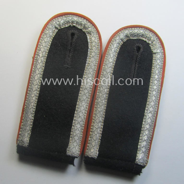 This is a very attractive - and just moderately used- and/or worn clearly used- and quite rarely found! - pair of Waffen-SS NCO-type- (ie. I deem fairly early-war-period) shoulderstraps as piped in the neat bright-orange- (ie. 'orangeroter'-) coloured branchcolour as was specifically intended for usage by an NCO (ie.: 'Unterscharführer' ie. junior-sergeant) who served within the: 'Waffen-SS Feldgendarmerie-Truppen' (or: field-police troops) and that comes in an overall veru nice- (and as stated above just moderately used ie. worn-), condition. The straps - which comes mounted onto their original and/or regular-shaped tongues as more often encountered on early-war-pattern Waffen-SS-type shoulderstraps - have the bright-orange- (ie. 'orangeroter'-) coloured and/or: desirable 'silk-like'-type piping attached (as can be seen on the pictures). The straps (which measure each 10,7 cms. in length as more often encountered) are executed in the black-coloured woo and have the field-grey-coloured 'underlays', as is more often observed with genuine Waffen-SS-type shoulderstrap-pairs. The pieces - which can I deem be dated around 1941/42 - show some moderate age, wear and/or staining (as can be seen on the pictures). The strap shows the (standard-pattern) silverish-coloured NCO-braid period-attached denoting that it was intended for usage by an NCO with the rank of: 'Unterscharfüher' (ie. junior-sergeant). Simply a very attractive - and truly rarely encountered! - Waffen-SS-related, NCO-type 'Feldgendarmerie' shoulderstrap-pair that is I deem accordingly priced!