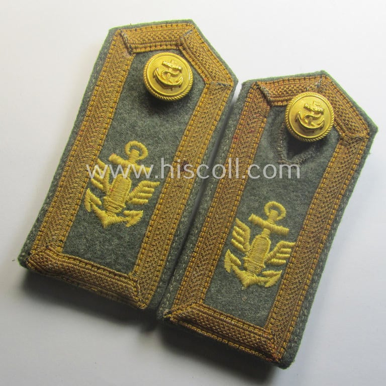 This is a truly attractive - fully matching and actually not that easily encountered! - neatly 'cyphered'- (and I deem) early- (ie. mid-) war-period pattern pair of NCO-type shoulderstraps as was specifically intended for usage on the field-grey coloured navy-style tunics as worn by an: 'Unterfeldwebel eines Küsten-Artillerie-Abteilungs' (or: junior-NCO ie. sergeant who served within a naval coastal-artillery unit) and that comes in an overall very nice- (and I deem just minimally used- ie. worn- and/or carefully tunic-removed-), condition. The straps - which are fully 'text-book' in all facets - measure both approximately 10,7 cms. in length (and have a width of approx. 5 cms. as more often seen) have the typical field-grey-coloured- and/or woolen-based 'upperdecks' and come mounted onto their period tongues (as can be noticed on the pictures). The straps show the typical (tarnished golden-toned) KM-pattern NCO-braid period-attached and do both show the neat interwoven 'winged-shell-anchor'-cyphers (as executed in golden-yellow-coloured linnen) denoting the senior-NCOs rank of an: 'Oberfeldwebel'. The straps do show some moderate age and/or wear (as can be seen on the pictures). This pair - that came with a pair of golden-toned, naval 'screw-on'-buttons (ie. 'Schraubknöpfe') attached - originates from a private-household in Germany where it was recently found. It should be noted that ALL 'Küsten-Artillerie' insignia-pieces are actually quite hard to encounter: those 'cyphered' examples even more so, which grades them easily as 'very scarce'. Simply an attractive - and neatly 'cyphered'! - naval NCO-type shoulderstrap-pair that was intended for usage on the field-grey-coloured attire!