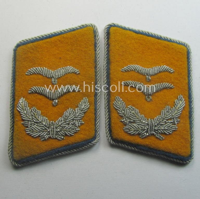 This is an attractive - fully matching and with certainty scarcely encountered! - pair WH (Luftwaffe) 'dual-piped', officers'-type collar-tabs (ie. 'Kragenspiegel für Offiziere der Luftwaffe') as was specifically intended for usage by a: Hauptmann der Reserve eines Flieger- o. Fallschirmjäger-Abteilungs o. Regiments' (or: reserve-captain who served within a pilot or paratroopers'-unit ie. regiment) and that comes in an overall very nice- (ie. just moderately used- and worn- and/or most certainly once tunic-attached-), condition. The - neatly hand-embroidered! - tabs are piped in the golden-yellow- (ie. 'goldgelbener'-) coloured branchcolour and do moreover show a secondary, bright-blue- (ie. 'kornblumenblauer'-) coloured branchcolour attached: as such, they were specifically intended for usage by a reserve-officer (ie. captain) who served within a: 'Flieger- o. Fallschirmjäger-Abteilungs o. Regiments'. The neat pieces are 'backed' with beige-coloured, buckram-based material and were with certainty carefully tunic-removed (as can be noticed from the pictures). It should, moreover, be noted that these attractive, dual-piped officers'-type 'Offizier der Reserve'-insignia-pieces as intended for a: 'Hauptmann der Reserve eines Flieger- o. Fallschirmjäger-Abteilungs o. Regiments' can easily be graded: 'fairly scarce' and come truly not that often offered for sale!