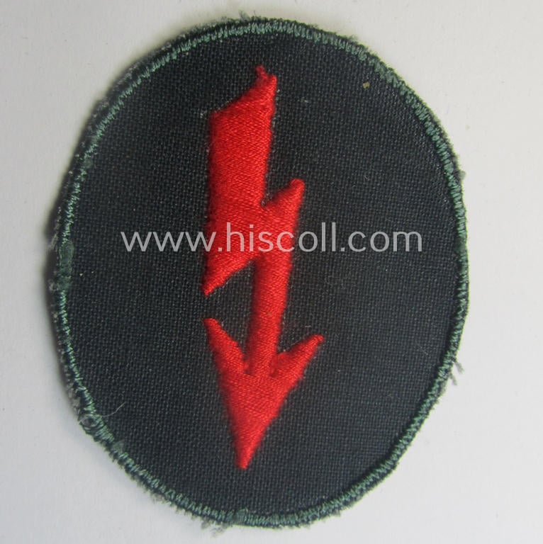 This is an attractive - and I deem simply never used- nor worn - example of a thin-shaped- (ie. 'variant'-pattern) so-called trade- and/or special-career insignia (ie. 'Signal Blitz') as was executed in the bright-red- (ie. 'hochroter'-) coloured branchcolour as was intended for a 'signals-operator' (or: 'WH-Nachrichtenpersonal') ie. soldier serving within the: 'Artillerie-Truppen' (ie. artillery-troops) and that comes in an overall very nice- (I deem simply never used- ie. still 'virtually mint- ie. unissued'-), condition. The patch is neatly machine-embroidered on darker-green-coloured (and thin-shaped!) linnen and shows no defaults whatsoever. The 'Blitz' is bright-red- (ie. 'hochroter'-) coloured and was as such intended for an: 'Artillerie'-soldier. The patch - which is void of a makers'-designation as more often - shows some minimal handling-age only. Simply an attractive thin-shaped- ie. 'variant-pattern' WH (Heeres) 'Signal-blitz' that is I deem accordingly priced!