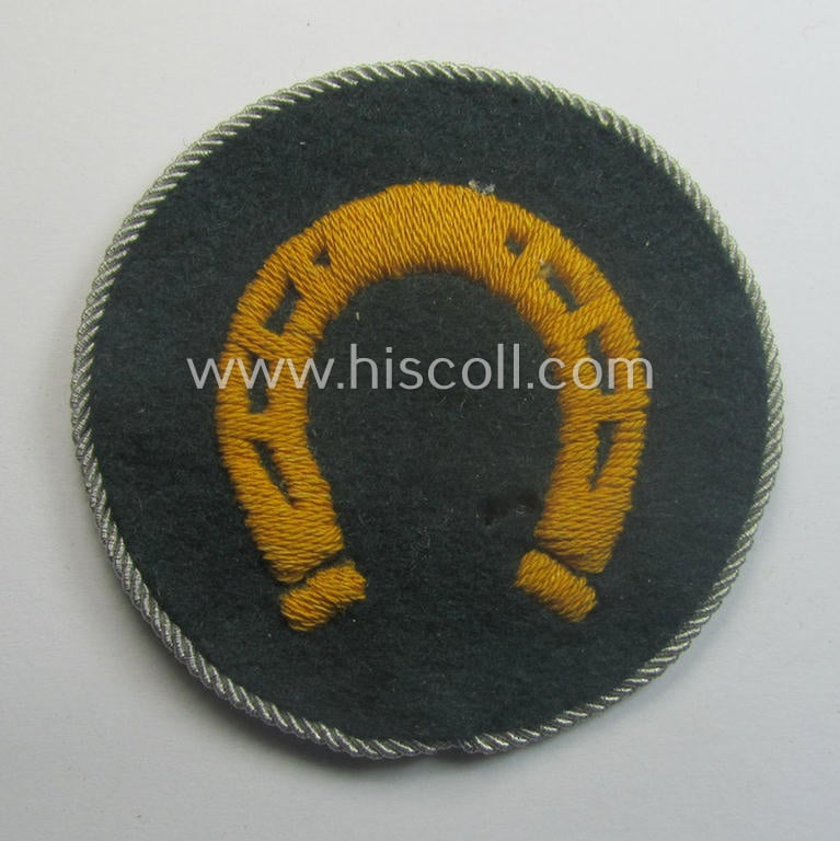 This is an attractive - and presumably issued and moderately used- and/or worn - example of a WH (Heeres) so-called: trade- and/or special-career arm-insignia (ie. 'Laufbahn- o. Tätigkeitsabzeichen') as was specifically intended for a: 'Hufbeschlagmeister' (o: qualified farrier ie. NCO) being a neatly machine-embroidered 'variant' that comes mounted onto a darker-green-coloured- and/or woolen-based background and that comes in an overall nice- (ie. clearly used- ie. I deem carefully tunic-removed-), condition. The neat patch is executed on darker-green-coloured wool and shows a detailed, golden-yellow-toned (and neatly machine-embroidered!) 'horseshoe'-symbol. The patch - which is backed with black-coloured linnen as more often - shows the additionally attached silver-coloured 'border' denoting that the soldier ie. NCO who wore it (ie. for whom it was intended) had succesfully passed several tests and could therefore be regarded as a: 'Geprüfter Hufbeschlagmeister'. The patch shows only moderate usage and staining, simply caused by decades of storage and/or moderate wear. Simply an attractive WH (Heeres) trade- and/or special-career arm-insignia (ie. 'Laufbahn- o. Tätigkeitsabzeichen')!