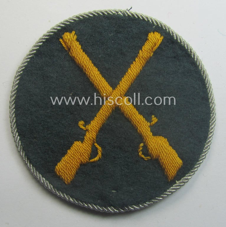 This is an attractive - and presumably issued and moderately used- and/or worn - example of a WH (Heeres) so-called: trade- and/or special-career arm-insignia (ie. 'Laufbahn- o. Tätigkeitsabzeichen') as was specifically intended for a: 'Waffenmeister' (or: weapon-equipment NCO) being a neatly machine-embroidered 'variant' that comes mounted onto a darker-green-coloured- and/or woolen-based background and that comes in an overall nice- (ie. clearly used- ie. I deem carefully tunic-removed-), condition. The neat patch is executed on darker-green-coloured wool and shows a detailed, golden-yellow-toned (and neatly machine-embroidered!) 'crossed-rifles'-symbol. The patch - which is backed with black-coloured linnen as more often - shows the additionally attached silver-coloured 'border' denoting that the soldier ie. NCO who wore it (ie. for whom it was intended) had succesfully passed several tests and could therefore be regarded as a: 'Geprüfter Waffenmeister'. The patch shows only moderate usage and staining, simply caused by decades of storage and/or moderate wear. Simply an attractive WH (Heeres) trade- and/or special-career arm-insignia (ie. 'Laufbahn- o. Tätigkeitsabzeichen')!
