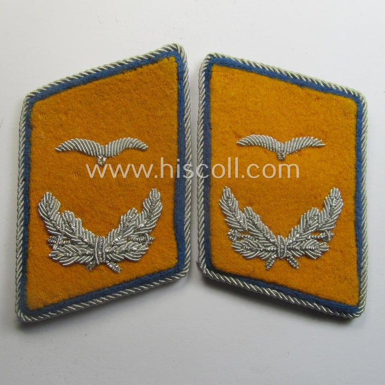 This is an attractive - fully matching and with certainty scarcely encountered! - pair WH (Luftwaffe) 'dual-piped', officers'-type collar-tabs (ie. 'Kragenspiegel für Offiziere der Luftwaffe') as was specifically intended for usage by a: 'Leutnant der Reserve eines Flieger- o. Fallschirmjäger-Abteilungs o. Regiments' (or: reserve-lieutnant who served within a pilot or paratroopers'-unit ie. regiment) and that comes in an overall very nice- (ie. just moderately used- and worn- and/or most certainly once tunic-attached-), condition. The - neatly hand-embroidered! - tabs are piped in the golden-yellow- (ie. 'goldgelbener'-) coloured branchcolour and do moreover show a secondary, bright-blue- (ie. 'kornblumenblauer'-) coloured branchcolour attached: as such, they were specifically intended for usage by a reserve-officer (ie. lieutnant) who served within a: 'Flieger- o. Fallschirmjäger-Abteilungs o. Regiments'. The neat pieces are 'backed' with beige-coloured, buckram-based material and were with certainty carefully tunic-removed (as can be noticed from the pictures). It should, moreover, be noted that these attractive, dual-piped officers'-type 'Offizier der Reserve'-insignia-pieces as intended for a: 'Leutnant der Reserve eines Flieger- o. Fallschirmjäger-Abteilungs o. Regiments' can easily be graded: 'fairly scarce' and come truly not that often offered for sale!