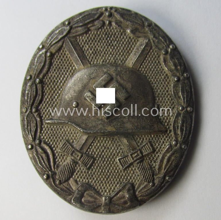 The neat - and just moderately used albeit typical zinc- (ie. 'Feinzink'-) based - silver-class wound-badge (or: 'Verwundeten-Abzeichen in Silber') shows only minimal age and wear and still retains almost all of its original, silverish-grey-coloured- (ie. typical zinc-like-) finish: it just shows some minimal wear and/or age (as can be seen on the pictures). The badge is as stated neatly (albeit as more often somewhat vaguely) maker-marked with the super-imposed makers'-designation: '65' on its back (as can be seen on the pictures) signifying that it deals with a typical piece as was produced by the: 'Klein u. Quenzer'-company as based in the town of Oberstein a.d. Nähe. Of course, are the (regular- ie. thin-shaped-) pin and/or (typical molded) catch (-set-up) fully functional and of course present. This piece has never been cleaned nor polished: it shows some minimal age, dust and/or staining as to be expected. Simply a very nicely preserved and just moderately worn example that is I deem accordingly priced!