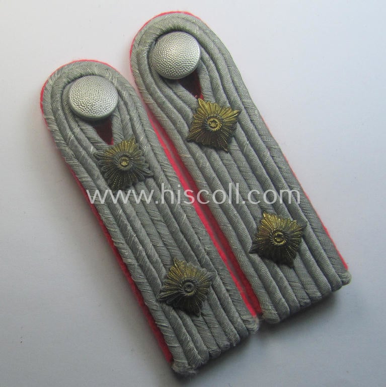 The attractive - and actually fairly scarely seen! - pair of WH (Heeres) shoulderboards on offer here are 'text-book'-examples of the typical Heeres'-type, 'Panzer'-related shoulderboards and have the silverish-grey- (ie. somewhat 'sub-dued'-type) 'upperdecks': they are (I deem) just moderately used- ie. worn and show some minimal age, wear and/or staining (as can be seen on the pictures). The boards show the desirable bright-pink- (ie. 'rosaroter'-) coloured branchcolour (and were constructed from the 'smooth-type' wool as to be expected). The boards came mounted onto their (smaller-sized) officer-type tongues attached. The boards measure approximately 11 cms. in length each and were clearly worn- ie. carefully tunic-removed (as can be seen on the pictures). The pair - that came with a set of silver-toned, so-called: 'screw-on' tunic-buttons (ie. 'Schraubknöpfe') attached - shows two matching sets of (neatly golden-toned, regular-sized- and/or fully identical) pips period-attached denoting that the pair belonged to an officer ie. captain who served within a: 'Panzer- o. Panzerjäger-Abteilungs' (ie. anti-tank- or tank-destroyer-unit). All four devices are just minimally stained- ie. tarnished but have preserved a fine and fairly bright- (and/or quite shiny) age-patina. Taking into account the fact that the set has silverish-grey- (ie. somewhat 'sub-dued'-type-) 'upperdecks' I deem that it was a pair that was used onto a typical front-used tunic. It should be mentioned that these 'Heeres'-type 'Panzer- o. Panzerjäger'-shoulderboards are actually quite hard to come by and can easily be graded 'scarce'. Simply a very attractive shoulderboard-pair that belonged to a: 'Hauptmann eines Panzer- o. Panzerjäger-Abteilungs'!