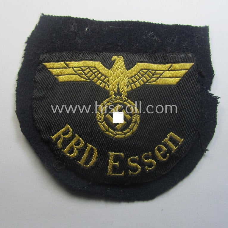 Truly worn- ie. 'cut-out', RB- ('Reichsbahn'-) related arm-eagle as executed in 'BeVo'-weave style as was intended for an official of the: 'Deutsche Reichsbahn' ie. the 'RBD Essen' (or: 'Reichsbahndirektion Essen')